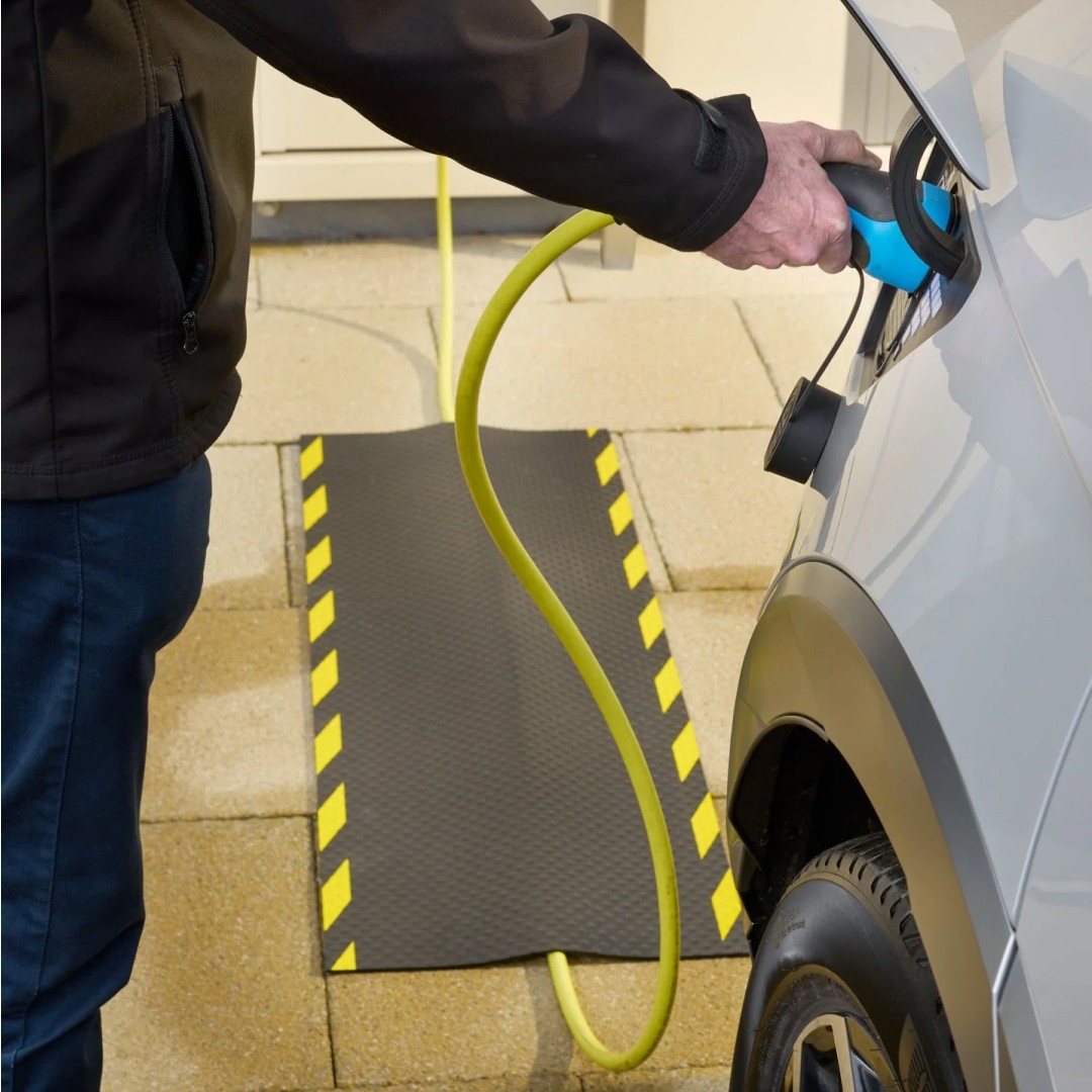 ChargeStep™ is een duurzame, laaggelegen kabel afdekmat die thuis opladen eenvoudiger en veiliger maakt. Het beschermt je laadkabel, houdt looppaden vrij en ziet er netjes uit op elke oprit of stoep. Simpel. Praktisch. Gemoedsrust, elke dag.
